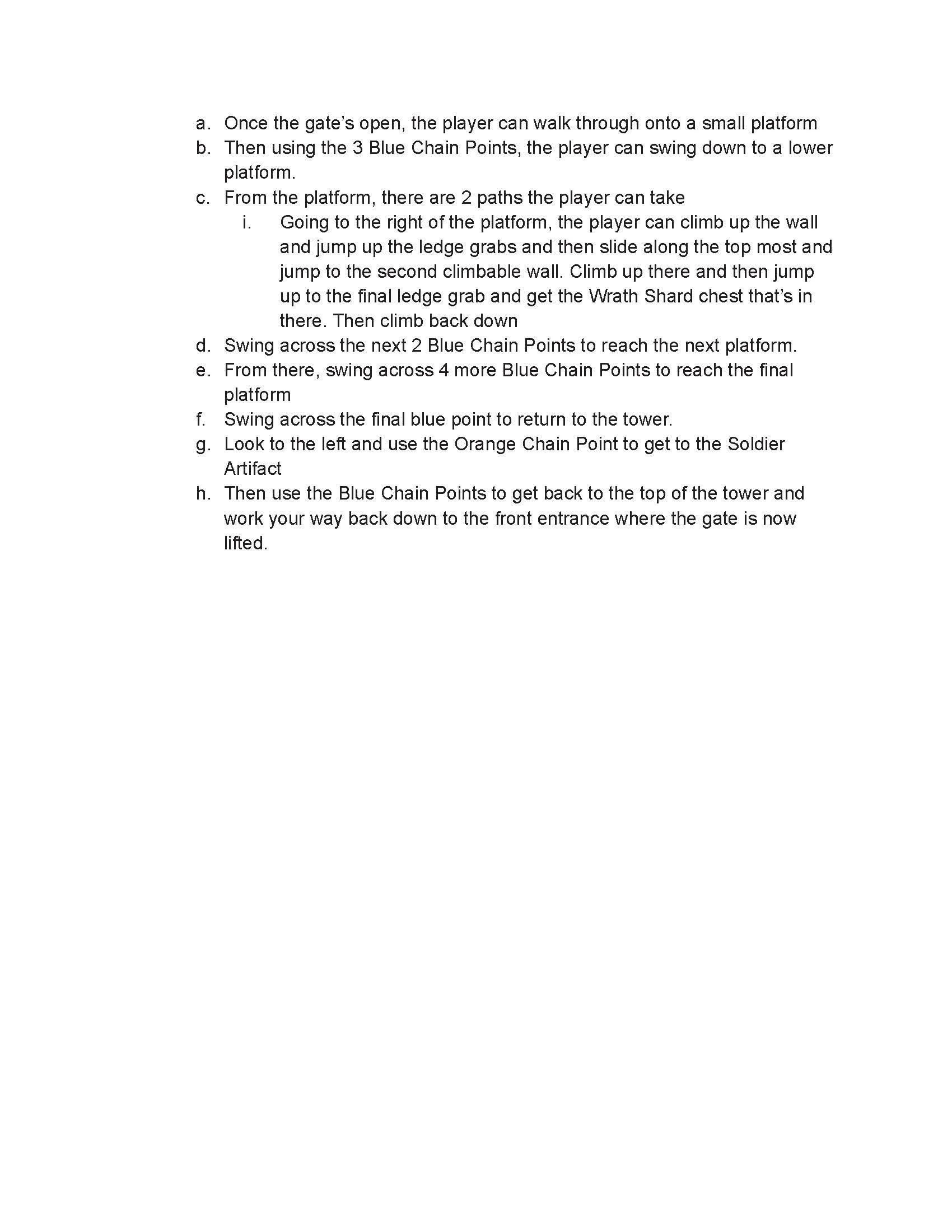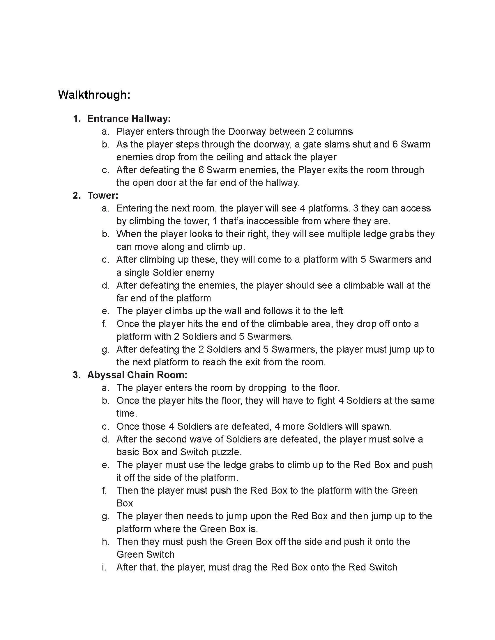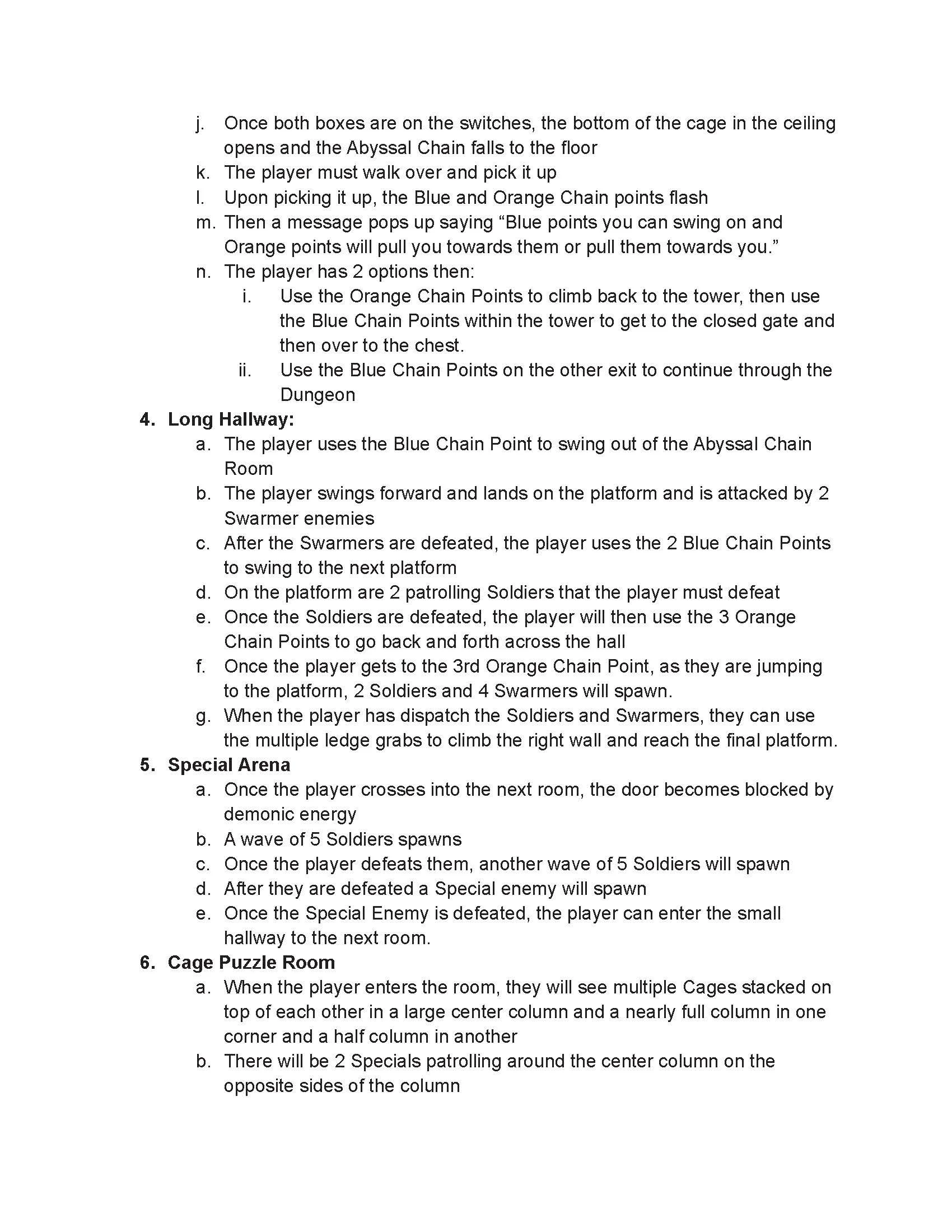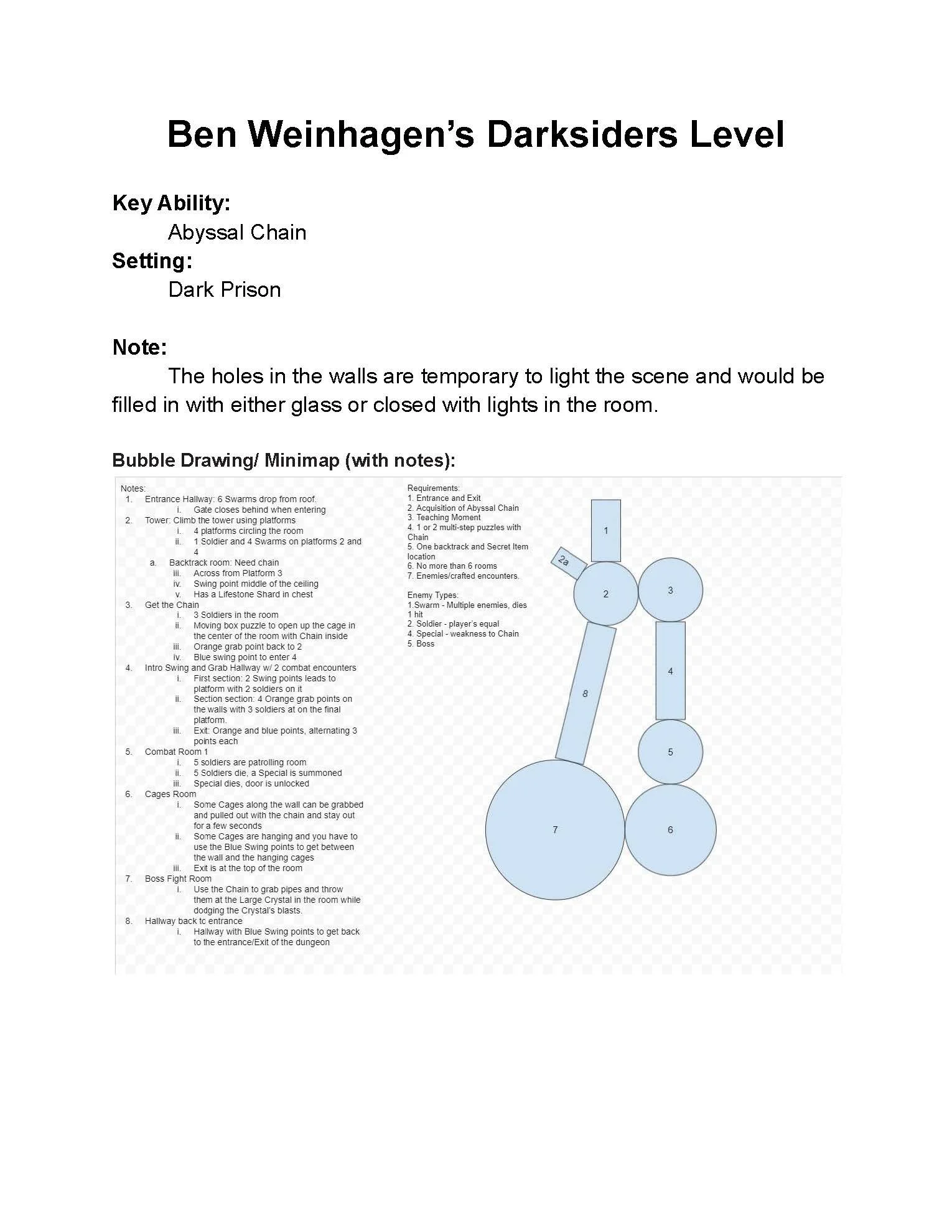 Darksiders Level Design Test: Paper Design The Basic Layout and Overview of my Abyssal Chain/Hookshot Level Design, with Bubble Map included with basic breakdown and notes. Description and base designs of major Beat rooms within level. Including Boss and Enemy Encounters. A Detailed Walkthrough of how the level flows and What should be included in each room.